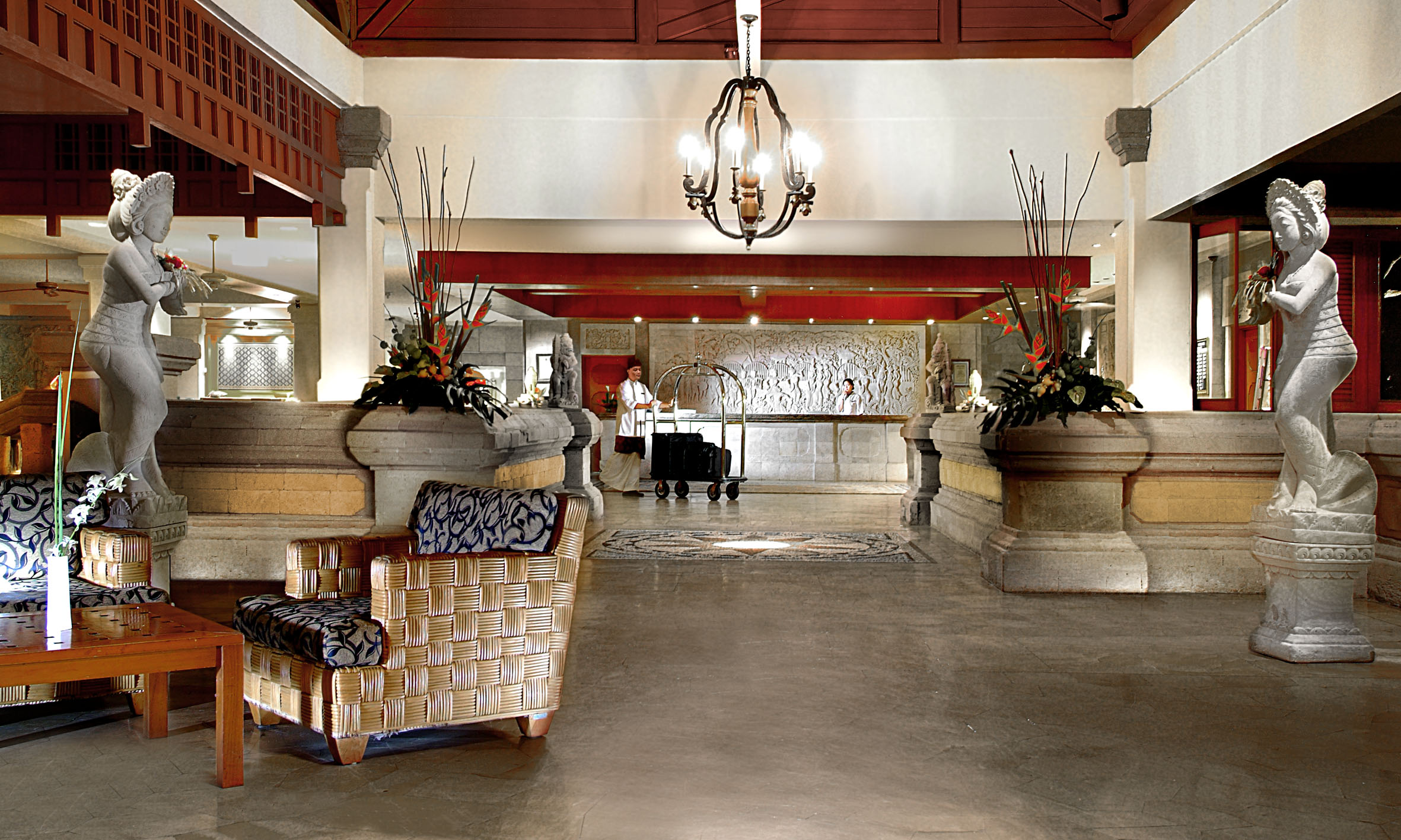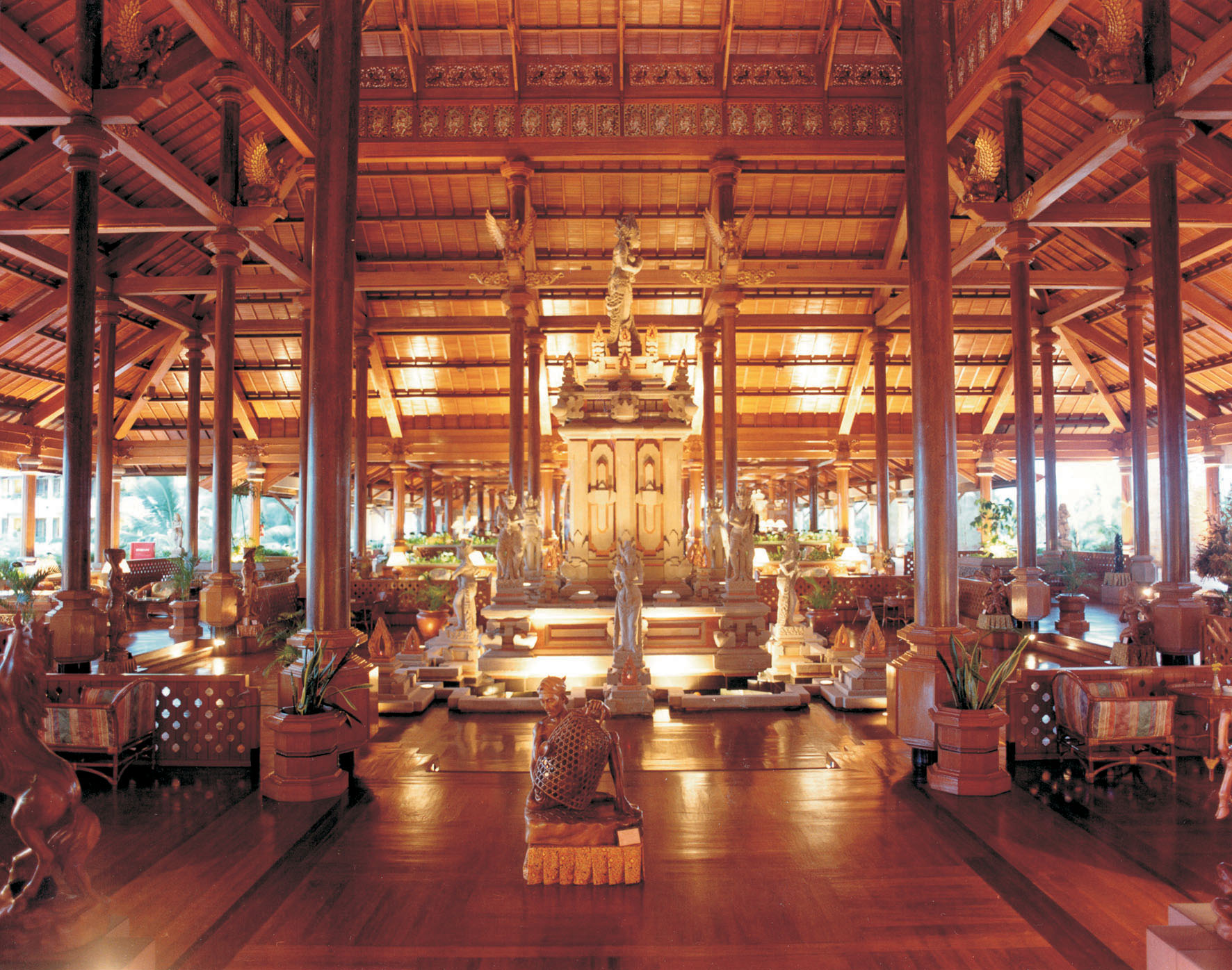 | ヌサドゥア開発の先駆けとして1983年にオープンした老舗の大型リゾート。世界各国の大統領や著名人達が宿泊し、世界的な会議に何度も利用されるだけあり、バリ宮殿のエレガントさが漂う館内には、老舗の貫禄と格式が溢れています。工芸品や伝統織物がふんだんに使われたバリスタイルの客室は、紫やオレンジ、ゴールドを基調とするパレス調の造りで居心地良く、2段ベッドのあるファミリールームや3名、4名専用の部屋もあるので、子供連れやグループのゲストに最適なホテルです。広大な敷地には、色鮮やかなブーゲンビリアやハイビスカスが咲く庭園が広がり、ラグーンプールやレストラン、キッズクラブなどあらゆる施設が揃っています。バリ島スパの火付け役ともなった「ヌサドゥア・スパ」では、豊富なプログラム・メニューが手頃な料金で受けられます。 |