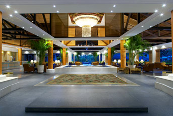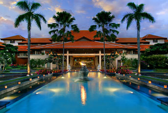 | ヒンズー教の神話の中で、ラマ王と美しい妻シンタが幸せに暮らした聖なる宮殿の名にちなんでつけられた「アヨディア・リゾート」は、ヌサドゥアビーチ沿いの 11.5万m²の広大な敷地に建つ大規模なホテルです。2006年9月、バリ・ヒルトン・インターナショナルから名称を変更。バリ様式の広々としたロビーやエントランス前に広がる巨大な噴水が見事です。広い敷地内には南国風の木々が生い茂り、屋外プール、全天候型テニスコート、スパ、キッズプログラム等様々な施設があり、隣にはアジアのベスト5に選ばれた「バリゴルフ&カント リークラブ」もあります。定評のある日本人向けのサービスも充実しています。 |