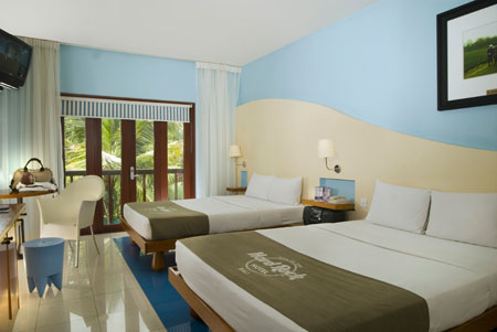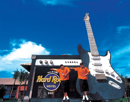 | 1998年に、ラスベガスに次いで、世界2番目に開業。ハードロックカフェが手がける音楽をテーマにしたホテルで、エンターテイメント型のデラックスホテルです。3ヘクタールの広大な敷地内には、レコーディングスタジオやハードロックカフェがあります。宿泊者をスターと呼んだり、プールサイドやプールの底には本物の白砂を使用するなど、建物やサービスの斬新さが伺えます。客室は、有名アーティストのタペストリーが飾られていて、レゲエ、ブルース、ロックンロールなどの音楽のジャンルに分けられていて、それぞれ基本カラーが決められています。いずれもテーマに沿った明るいインテリアでまとめられています。メインプールの広さはバリ島内でも最大級の広さで、泳ぎながら水中で音楽が聴けます。立地もクタ中心で、ビーチに面していますので、好立地です。 |
