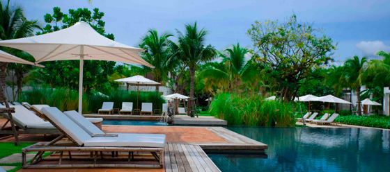 | ホアヒンの中心部から車で約10分の山間の開けた場所に位置する豪華リゾート。各国で数々の5ッ星スパリゾートを手がけた建築家によりデザインされ、最大限のプライバシーや細部にまで目の行き届いたヴィラを設計しています。南国らしい緑豊かな風景が広がる10エーカーの静寂に包まれた美しい敷地内にタイ伝統様式のヴィラが点在しています。3つのそれぞれの客室タイプはスタイリッシュなデザインで、1ベッド又は2ベッドルームタイプとなり、全棟にプライベートプールとテラスが付いて、気ままに寛ぐ事が出来ます。ひとつひとつの区画が広くプライベート感たっぷりなのも大きな魅力です。 |