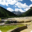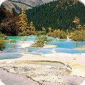 終日:エメラルドグリーンに輝く池が幾十にも重なり石灰岩と清流が創り出した独特の景観が素晴らしい、【世界遺産】・『黄龍』観光へご案内致します(移動約3時間)途中、雪山梁子にて万年雪をたたえた眠山山脈の最高峰5,588mの雪宝頂をご覧下さい。