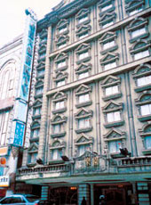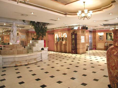 | 台北の原宿と言われる西門町の繁華街の一角に位置し、MRT西門駅にも近く、観光に便利な立地です。ーロッパ調のグレーの建物の館内はきらびやかなインテリアが特徴で、玄関に入ると大理石の円柱や彫刻が置かれ、壁や天井には西洋絵画が飾られている。客室は金色と臙脂色でまとめられ、意外とすっきりと落ち着いた印象です。1998年に改装し、館内や室内は清潔感があります。 |